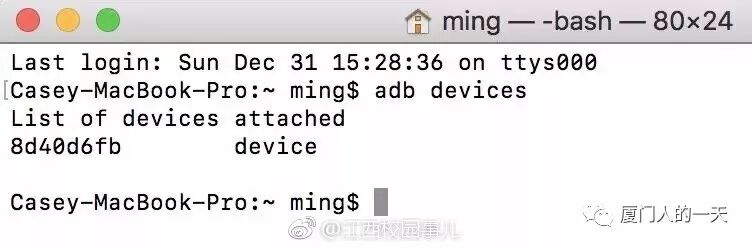 9、在终端输入 adb devices,如果看到下面这种信息,说明 adb 已正确安装,也说明电脑成功检测到手机;