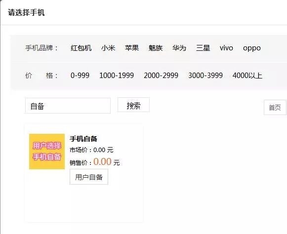 选择手机时,若不需要手机,在搜索栏输入自备,选择即可。